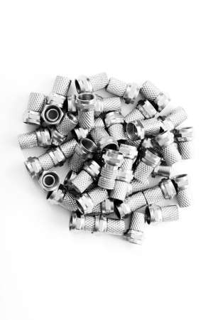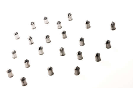 Repair of winter studded tires. Repaired spikes scattered on a white background. Replaced lost tire spikes.