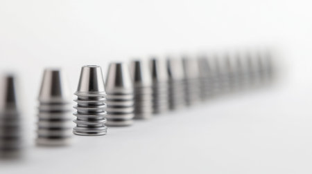 A row of dental implants displays smooth metal and ceramic materials on a white background, providing ideal space for text above.