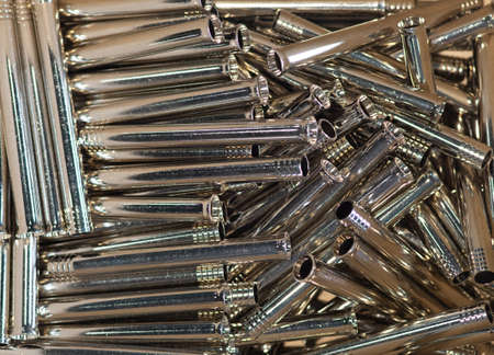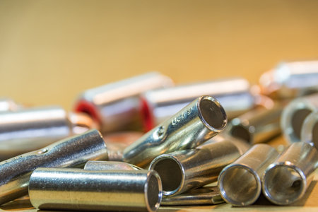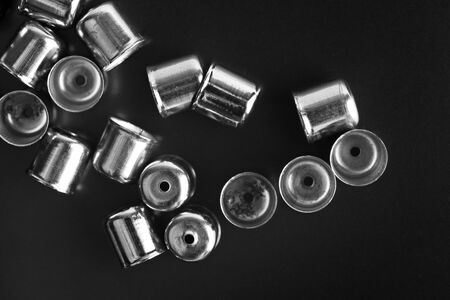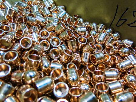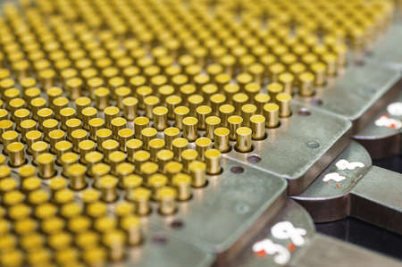Bullet casings on dark background at armor production plant