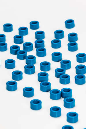 Electronic Components Concepts. Variety of Ferrite Magnetic Cores of Blue Color. Isolated On White. Vertical Image