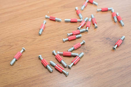 Group of Dowels and Nails on wooden background. Dowels for fastening in concrete. Stock photo.