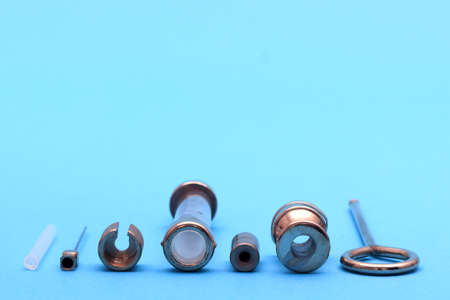 antique syringe disassembled into details on blue background