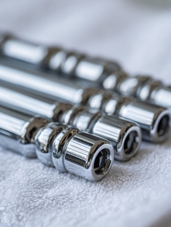 A collection of polished metal socket extensions rests on a textured white background, their sleek surfaces catching light, with detailed tool heads in sharp focus.