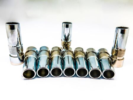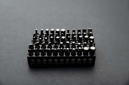 Group of metal various forms of nozzles for a screwdriver close up stand on a black background. background for web sites. close-up.