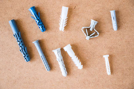 Large group of different plastic wall plugs on the brown background, high angle view