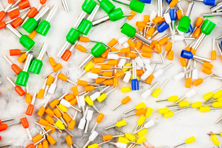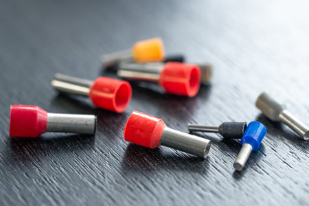 Coloured crimp terminals for different wire sizes. Copper sleeves for crimping electrical cables. Ferrules. Selective focus, copy space