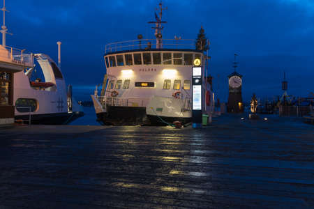 OSLO, NORWAY - DECEMBER 22, 2019: Ferry boats at Aker Brygge district at sunset. Since the 1980s and 1990s it has been a popular area for shopping, dining, and entertainment, as well as a high-end residential area. It was previously an industrial area.