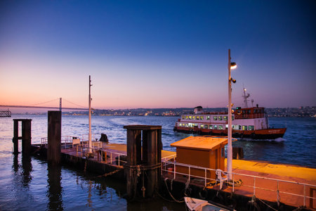 LISBON, PORTUGAL - February 01, 2011: The Tagus River past the 25 de Abril bridge from Cacilhas, night falling on the docks