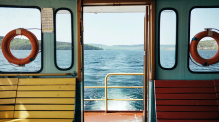 A ferry boat gliding across calm waters, with passengers enjoying the view from the deck.. --ar 16:7 --v 6.1 Job ID: 5576016b-7efd-4ed7-9539-652556d18a82