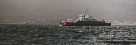 Red ship sailing near the rocky shore of Firth of Clyde river, panoramic view from yacht. Dramatic sky. Scotland, UK. Travel destinations, eco tourism, vacations, pure nature. Atmospheric landscape