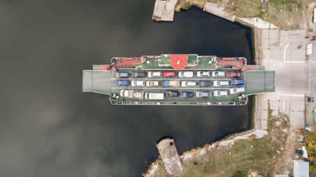 top down view of ferryboat. Ferryboat transferring cars. Ferry transfers cars and passengers to the other side
