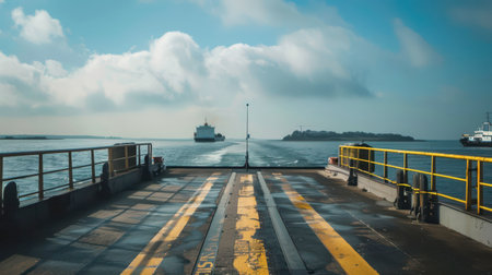 The view from the deck of a ferry as it approaches a larger ship sailing away. The larger ship is in the distance and is leaving a wake. The ferry is docked and the yellow railings are visible, along with a striped road leading to the front of the boat. The sky is partly cloudy.