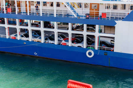 CORFU ISLAND, GREECE - JUNE 26, 2017: Car ferry and people departing from Corfu island, Greece