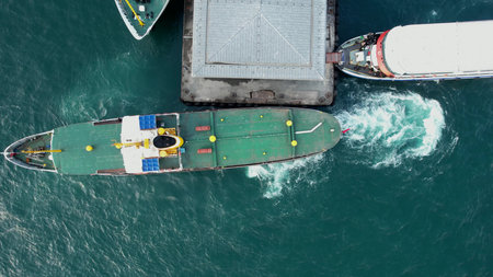 Top view of ferry boat moored in the pier.