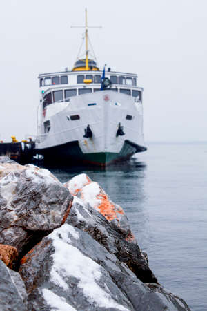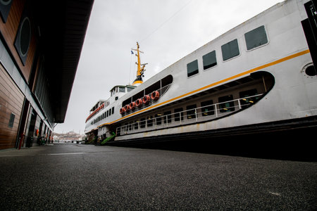 Istanbul, Turkey - October-27.2019: Rear view of the ferry anchored in the pier. One of the oldest ferries. Photographed on a cold day in cloudy weather.