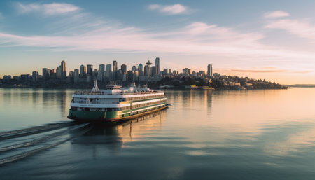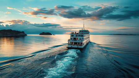 A ferry glides across tranquil waters under a beautiful sunset sky, reflecting warm colors