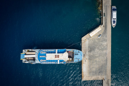 Cars drive off the deck of ferry boat onto the port in island. Top-down aerial drone shot