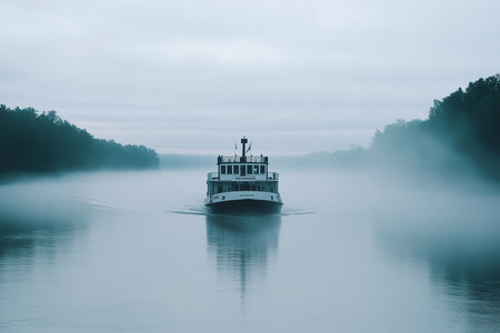 A captivating and picturesque scene of a majestic steamboat gracefully navigating through a foggy river landscape. Generative AI