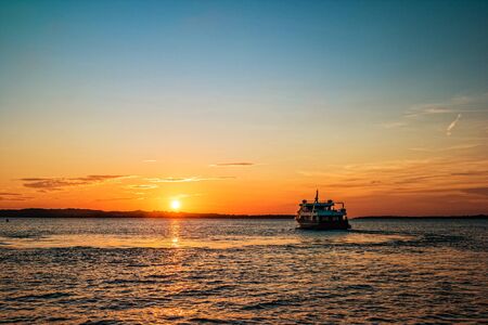 Sunset with ship sailing to the Brijuni Islands in Fazana, Croatia.