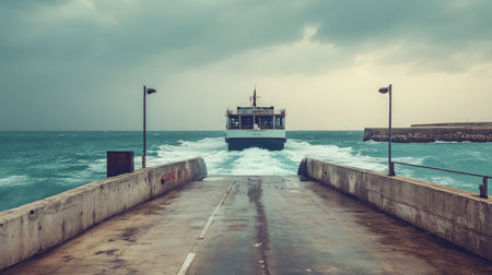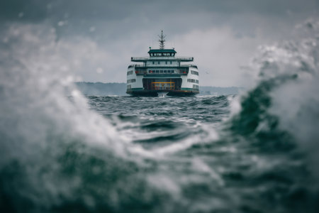 A ferry moves toward the harbor under a dramatic overcast sky, creating a captivating scene with turbulent waves and a sense of adventure on this gloomy day.