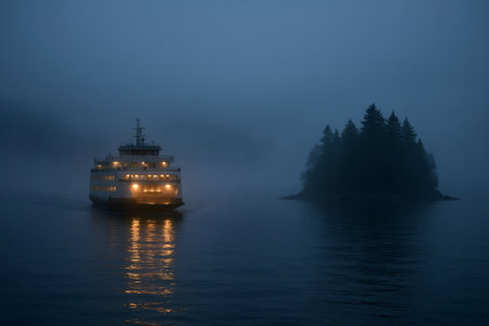 A large ferry moves through thick fog on calm waters during a misty early morning. Passengers enjoy the serene atmosphere while surrounded by haze and silence.