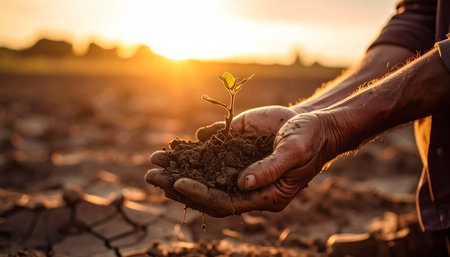 A pair of weathered hands gently cradles a young plant growing from parched soil symbolizing hope and resilience during drought Use for environmental awareness campaigns.