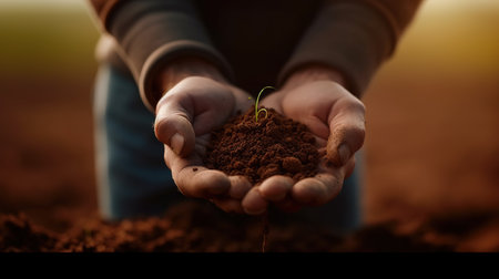 A close-up view of hands holding rich soil with a small green seedling emerging, symbolizing care, growth, and connection to nature.