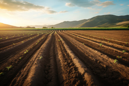 Empty farmland with rows of furrows extending to the horizon, leaving space for copy
