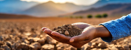 A close-up view of a hand holding dry soil in a barren field under a clear sky, symbolizing drought and environmental challenges.