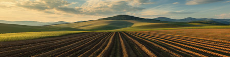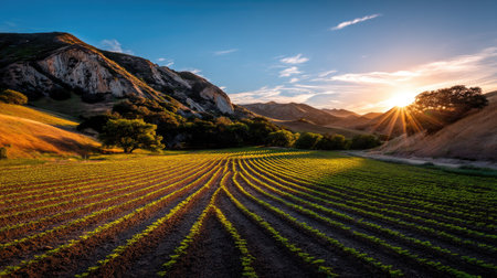 A lush green field of crops stretches out into the distance, with a warm sunset casting a golden glow over the scene. The rolling hills in the background add to the beauty of this tranquil landscape.