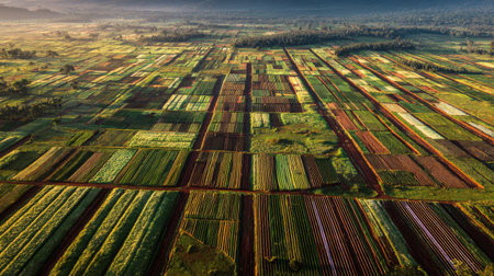 A stunning aerial shot showcasing a patchwork of colorful agricultural fields, revealing diverse patterns and natural beauty lit by morning sunlight.