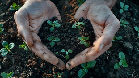 Hands are gently placing seeds into fertile soil, surrounded by emerging green plants, illustrating the nurturing process of gardening and agricultural practices, AI generated