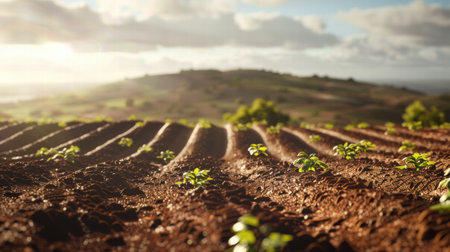 A vibrant sunrise bathes a field of young, green plants in a golden glow, highlighting the fresh start of a new day on the farm