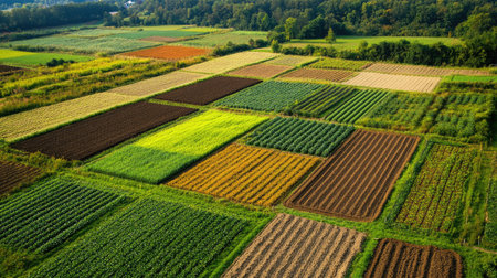 Top view of nature landscape fields planted with cereals and crops, aerial survey of crops on a sunny day on the farm. Generative AI.