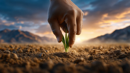 Hand gently places green sprout into rich, textured soil under a stunning sunset sky. Warm glow highlights mountains in background. Concept of gardening, agriculture, sustainability.