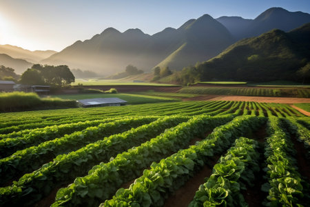Organic Lettuce Field Sustainable Farming Amidst Morning Mountainscape