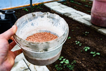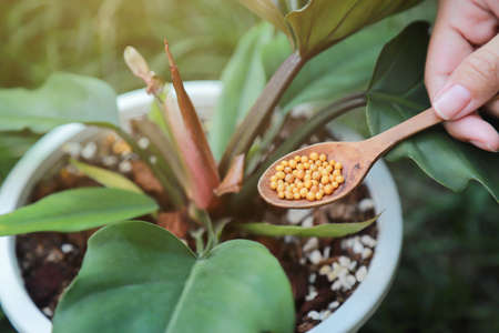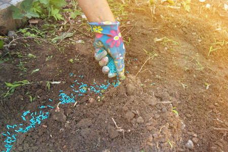 Fertilizing the garden by bio granular fertilizer for better conditions of garden, gardening concept
