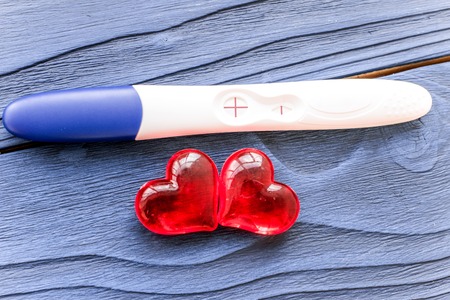 Doctors stethoscope and a positive pregnancy test on a pink background