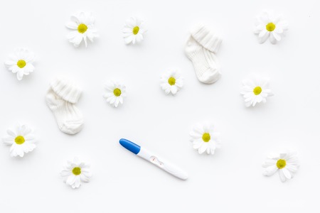 Joy of long-awaited pregnancy. Pregnancy test with two stripes near flowers on white background top view.