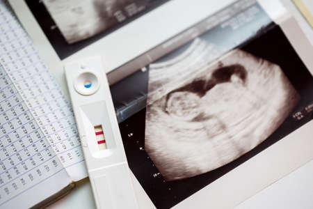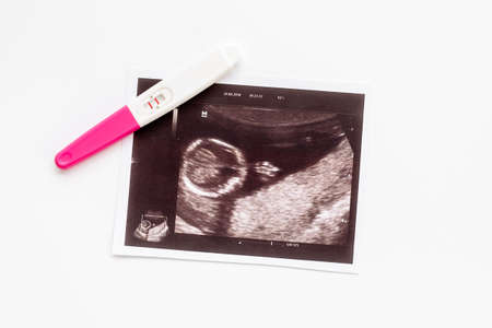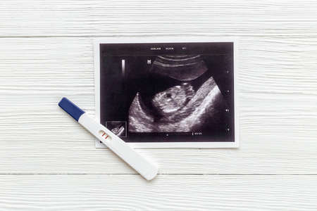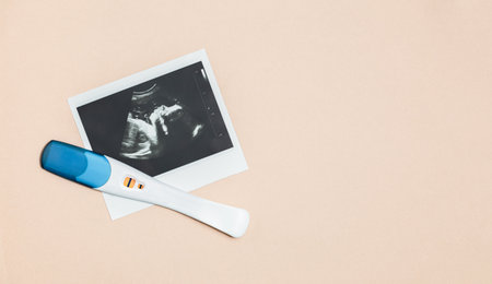 ultrasound picture with baby and pregnancy test on beige background with copy space