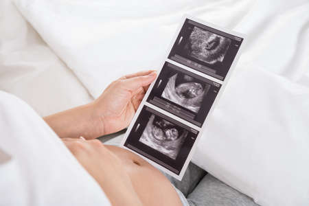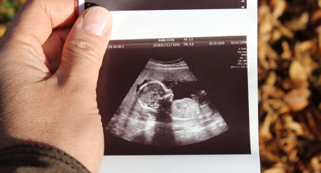 Ultrasound image pregnant baby photo. Woman holding ultrasound pregnancy picture. Pregnancy, medicine, pharmaceuticals, health care and people concept