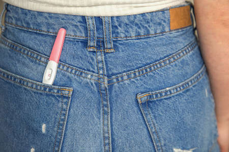 Young woman with positive pregnancy test in pocket of jeans close-up motherhood happiness modern retro background