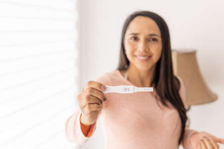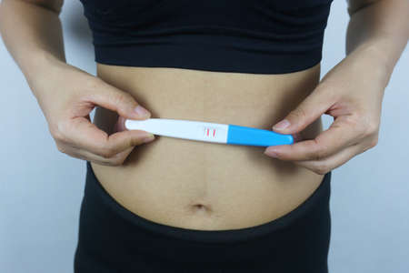 Pregnancy test tool in woman's hand,Results of tests Demonstrating pregnancy,A woman in black dress.