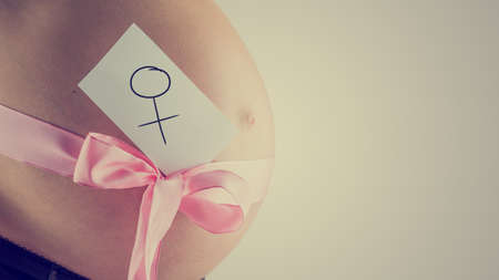 Side view of the swollen bare belly of a young pregnant woman expecting a baby girl or daughter tied with a pink ribbon and bow with a label showing the female gender sign, with copyspace.