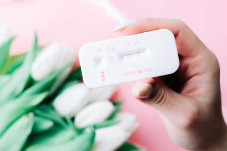 Pregnancy test couple. Positive woman pregnant test in hands with pink silk ribbon on tulips flower pink background. New life and new family. Motherhood, pregnancy, birth control concept