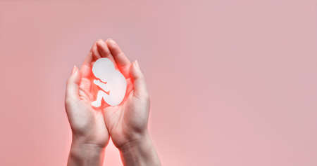 Woman's palms pressed together and keep paper embryo. Light pink background with copy space. soft focus.