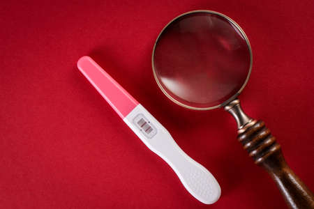 Pregnancy test kit. Female hand hold positive pregnant test with silk ribbon on pink background. Medical healthcare gynecological, pregnancy fertility maternity people concept