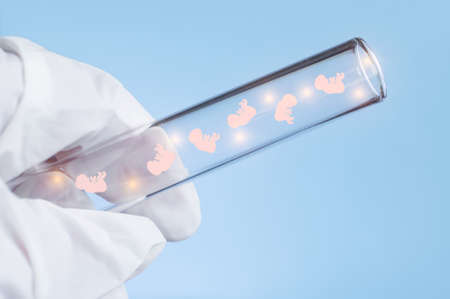 Medical laboratory. The doctor's gloved hand holds a test tube with human embryos. The concept of artificial insemination. Elements of a bitmap drawing. Close-up.