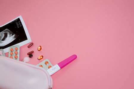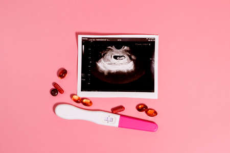 Ultrasound image of the baby and medicines. Pregnancy. Treatment of female infertility concept.