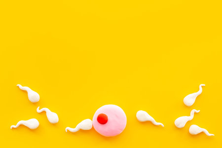 Fertilization concept. Sperm cells swimming towards egg cell on gray background, top view